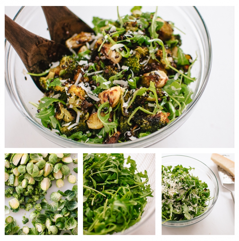 Նախապես տաքացնել ջեռոցը մինչև 218 ° C աստիճան և ծածկել ջեռոցի մեծ տապակը յուղաթղթով: Կտրտել բրոկոլին մինչև մեկ անգամ կծելուն հարմար չափի: Կտրել բրյուսելյան կաղամբի ծայրերը, փոքրերը բաժանել 2, իսկ մեծերը՝ 4 մասի: Բրոկոլին և կաղամբը թաթախել ձիթապտղի ձեթի մեջ, այնուհետև աղ և պղպեղ ցանել: Մեկ շերտով տարածել տապակի վրա: Թողնել, որ եփվի մոտ 20-30 րոպե, այդ ընթացքում խառնելով մեկ անգամ, մինչև բանջարեղենը դառնա նուրրբ խրթխրթան: 2. Միաժամանակ ¾ բաժակ ջուր եռացնել միջին չափի կաթսայի մեջ: Ավելացնել ոսպը, թուլացնել կրակը, ծածկել և թողնել, որ եփվի 15-20 րոպե մինչև ոսպը փափկի, սակայն չկորցնի ձևը: 3. Մինչ բանջարեղենը և ոսպը կսառեն, խառնել սոուսի համար նախատեսված բաղադրիչները: Մեծ տարայի մեջ խառնել տապակած բանջարեղենը, եփված ոսպը և ռուկոլան: Ավելացնել սոուս, պարմեզան պանիր և լավ խառնել: Ավելացնել աղ, պղպեղ և/կամ կիտրոնի հյութ ըստ անհրաժեշտության: Մատուցել անմիջապես: